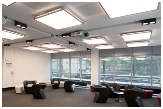 应用范例:办公室使用20盏LED平板灯,搭配 LCM-40DA。办公室有3个不同区域,设计者可透过DALI控制器将这20盏灯分配到3个不同群组。设定容易也易于未来变更。